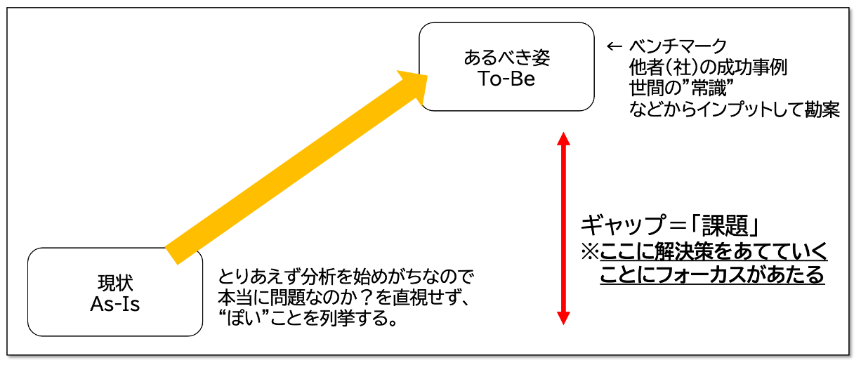 大企業のビジネスパーソンは、往々にして以下のAs-is/To-beの基本フレームを叩き込まれてプロジェクトを遂行したり事業を展開したりしています。
